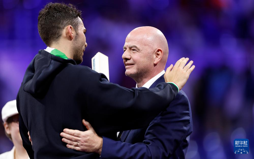 7月30日,国际足联主席因凡蒂诺(右)在颁奖仪式后祝贺亚军意大利选手菲利波·马基。