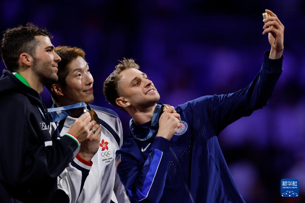 7月30日,冠军中国香港选手张家朗(中)、亚军意大利选手菲利波·马基(左)与季军美国选手伊特金在颁奖仪式上合影。