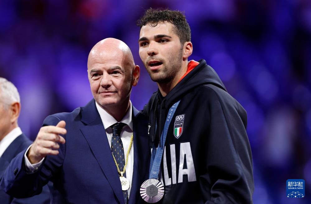 7月30日,国际足联主席因凡蒂诺(左)与亚军意大利选手菲利波·马基在颁奖仪式上。