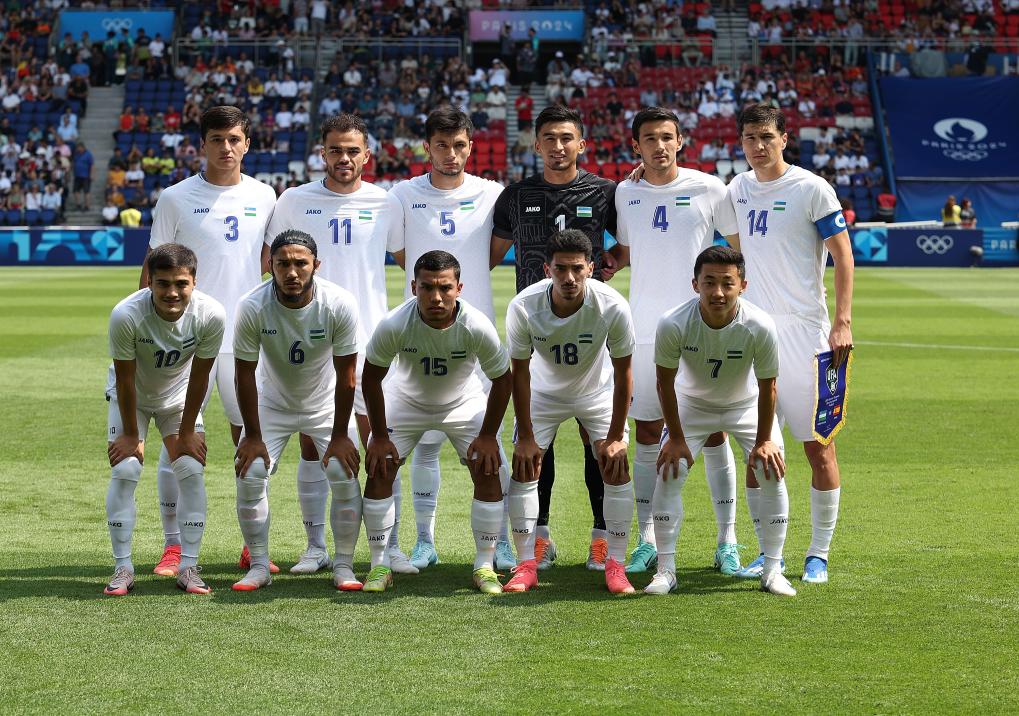 7月24日,乌兹别克斯坦队首发球员在赛前合影。当日,在巴黎进行的2024巴黎奥运会男足小组赛C组比赛中,西班牙队对阵乌兹别克斯坦队。新华社记者 黄宗治 摄