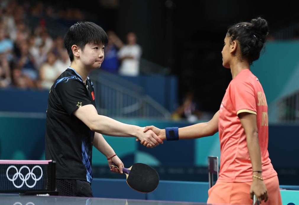 7月31日,孙颖莎(左)和阿库拉在比赛后握手致意。新华社记者 王东震 摄