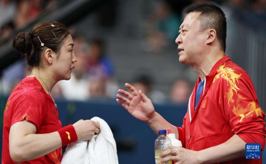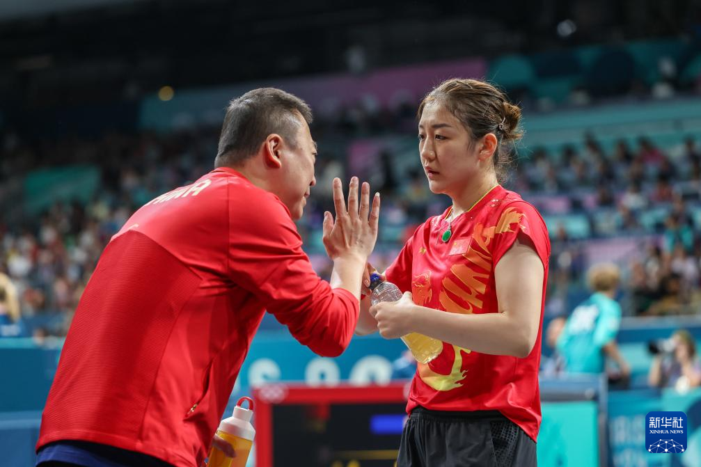 7月31日,陈梦(左)在比赛间隙接受教练马琳指导。新华社记者 王东震 摄
