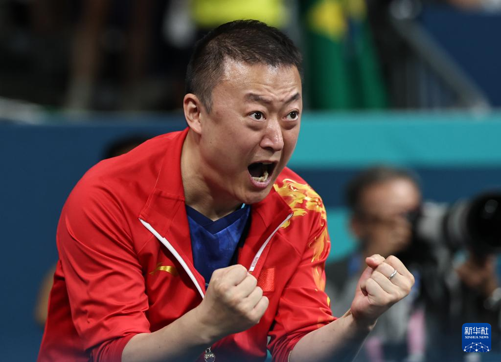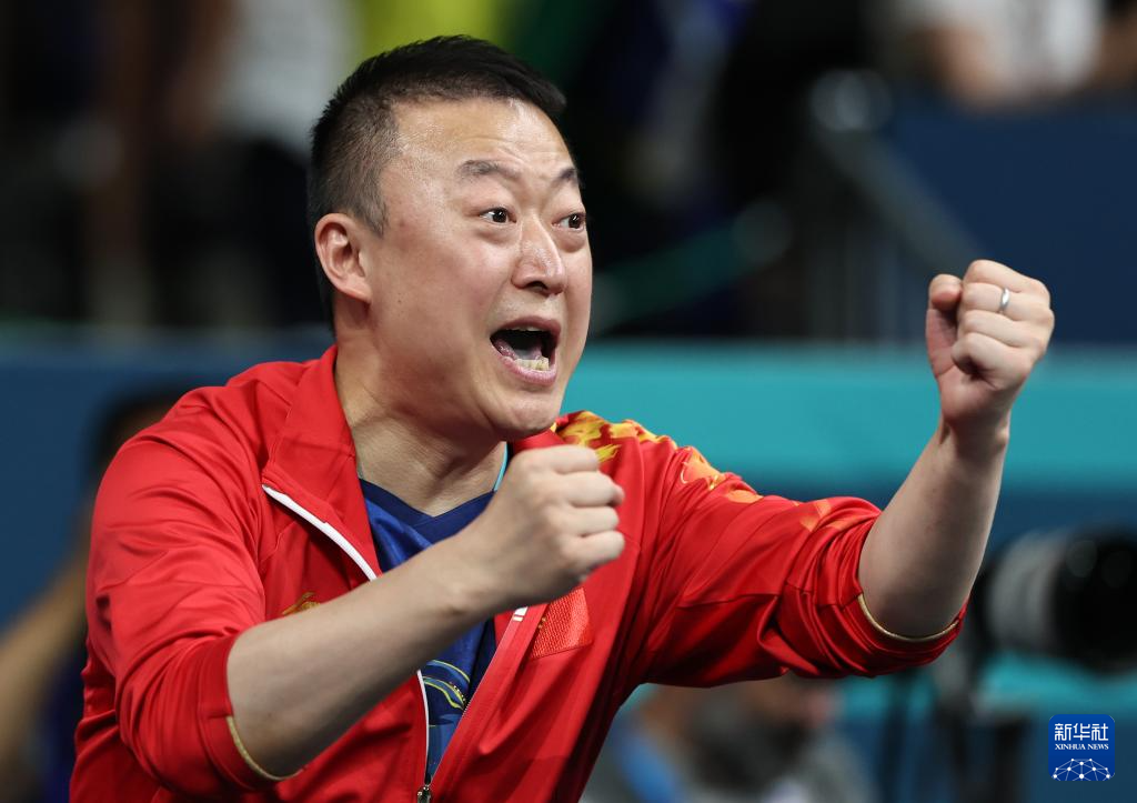 7月31日,中国队教练马琳在庆祝陈梦得分。新华社记者 王东震 摄