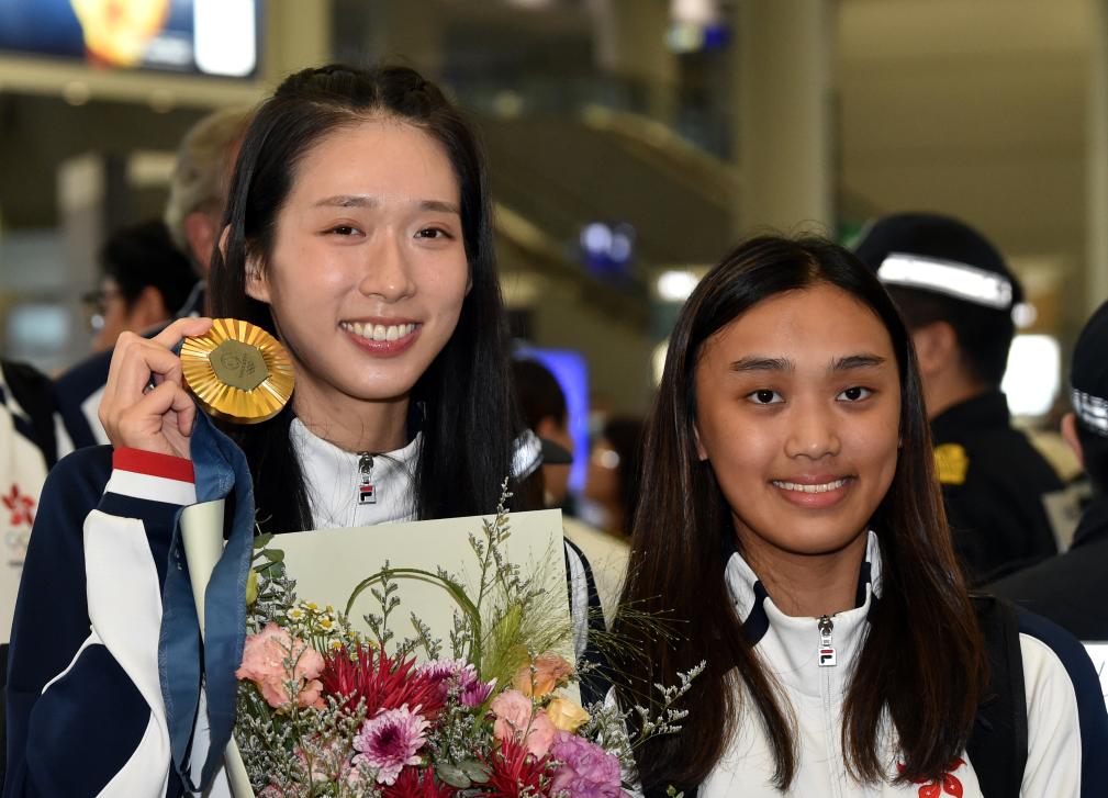 8月1日,中国香港女子击剑队运动员江旻憓(左)和队友陈诺思抵达香港。新华社记者 卢炳辉 摄