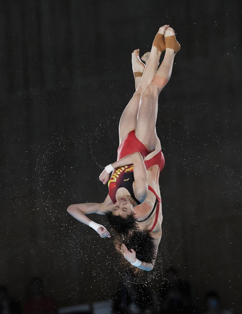 7月31日,中国选手陈芋汐/全红婵(前)在比赛中。新华社记者 李颖 摄