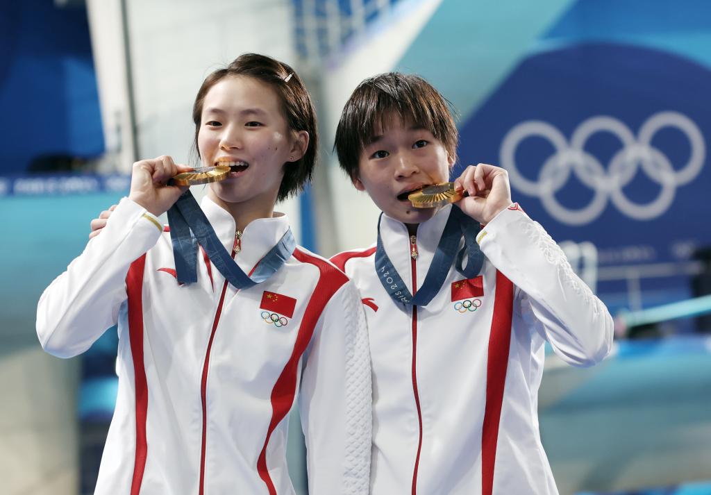 7月31日,冠军中国选手陈芋汐(左)/全红婵在颁奖仪式上。新华社记者 张玉薇 摄