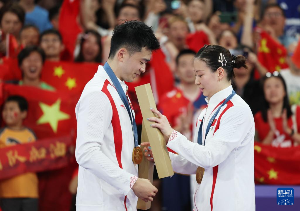 8月2日,黄雅琼(右)在颁奖仪式上给队友郑思维戴上金牌。
