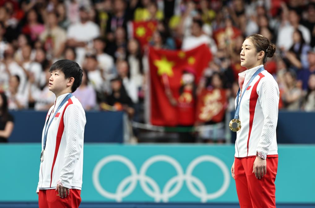 8月3日,冠军陈梦(右)、亚军孙颖莎在颁奖仪式上。新华社记者 王东震 摄