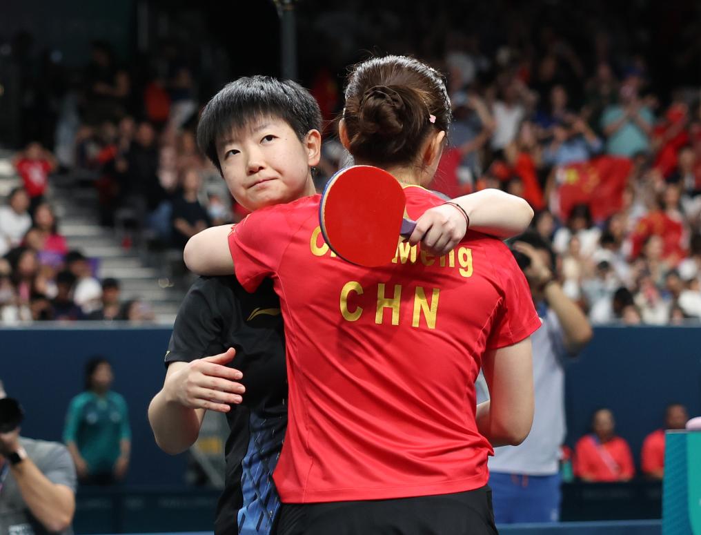 8月3日,陈梦、孙颖莎在比赛后拥抱。新华社记者 刘续 摄