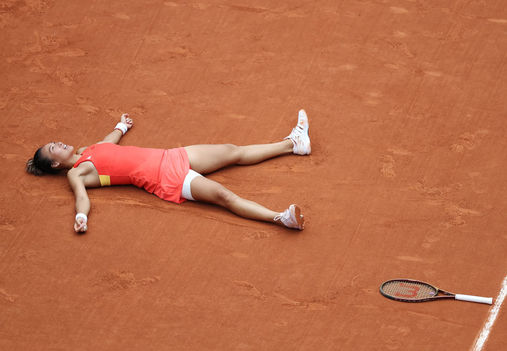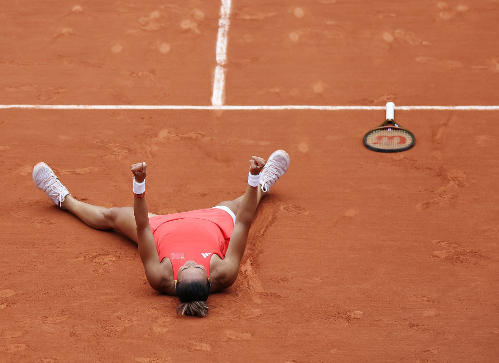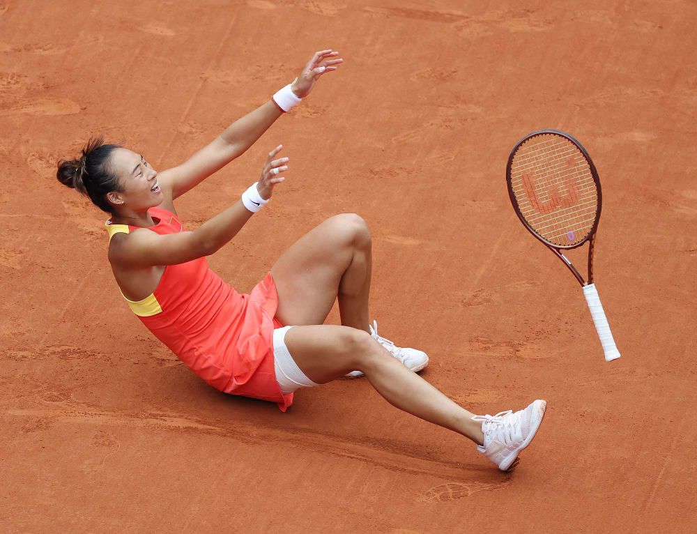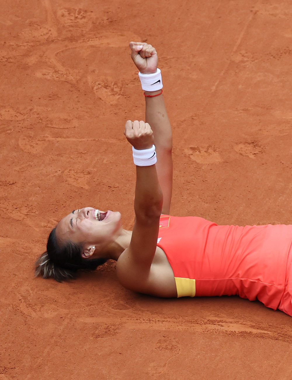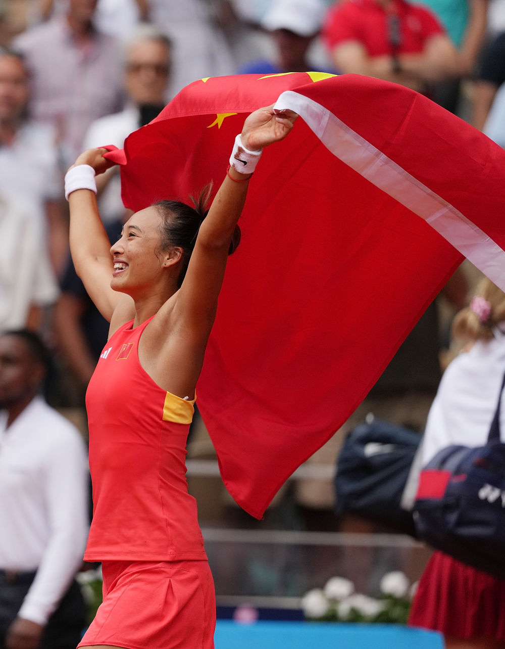 ↑郑钦文在比赛后身披国旗庆祝夺冠。新华社记者 万象 摄