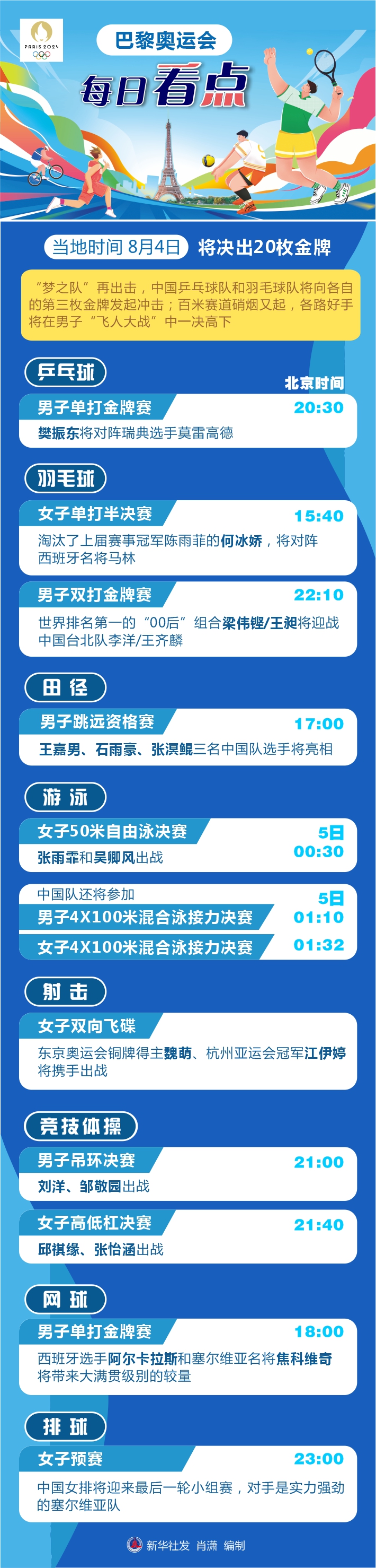 新华社巴黎8月3日电(记者丁文娴、张泽伟)4日,巴黎奥运会将诞生20枚金牌。“梦之队”再出击,中国乒乓球队和羽毛球队将向各自的第三枚金牌发起冲击;百米赛道硝烟又起,各路好手将在男子“飞人大战”中一决高下。