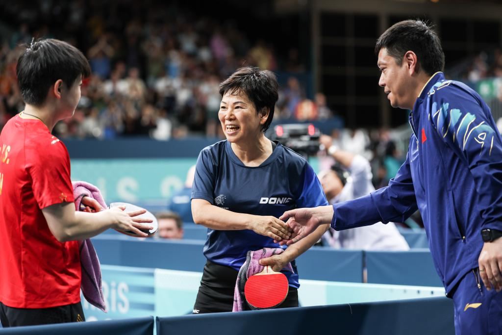 7月31日,倪夏莲(中)赛后和中国队教练员握手。当日,在巴黎奥运会乒乓球女子单打32强赛中,中国选手孙颖莎4比0战胜卢森堡选手倪夏莲,晋级16强。新华社记者 朱峥 摄
