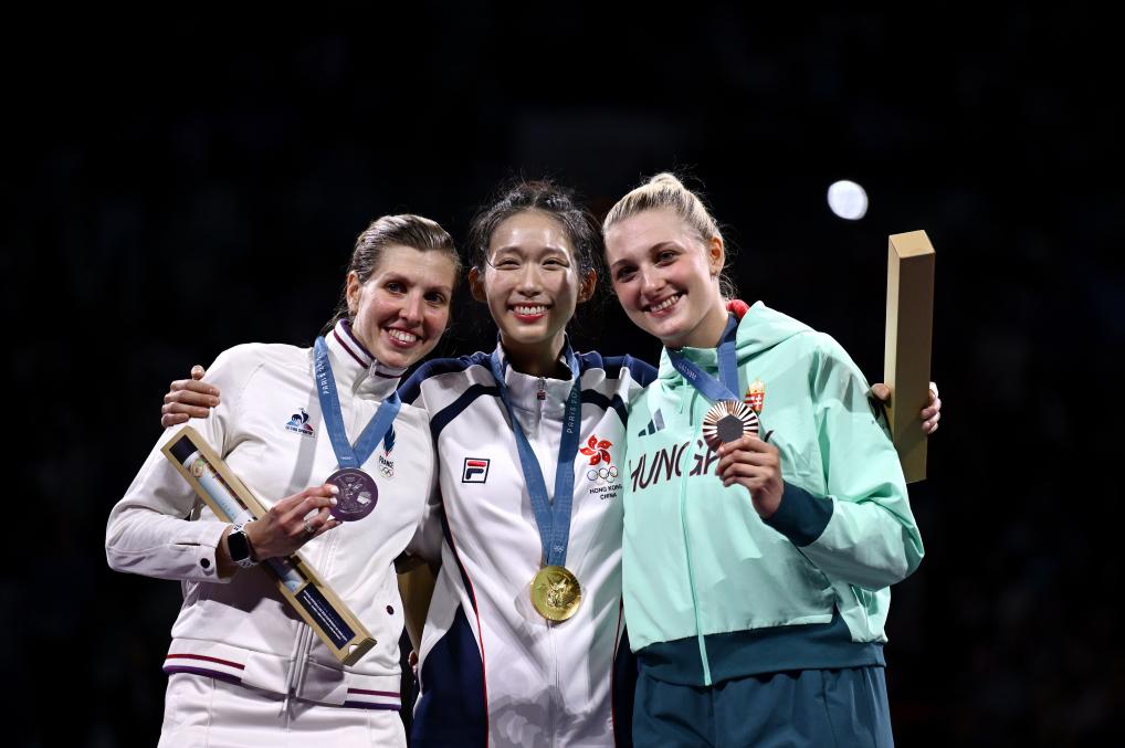 7月27日,冠军中国香港选手江旻憓(中)、亚军法国选手马洛-布雷东(左)和季军匈牙利选手穆豪里在颁奖仪式上合影。当日,在巴黎奥运会击剑女子个人重剑金牌赛中,中国香港选手江旻憓13比12战胜法国选手马洛-布雷东,夺得冠军。新华社记者 张宏祥 摄