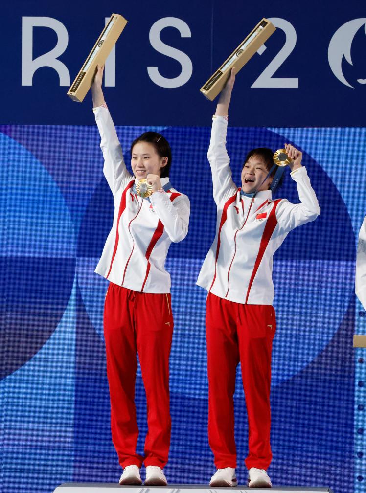 7月31日,冠军中国选手陈芋汐(左)/全红婵在颁奖仪式上。新华社记者 张玉薇 摄