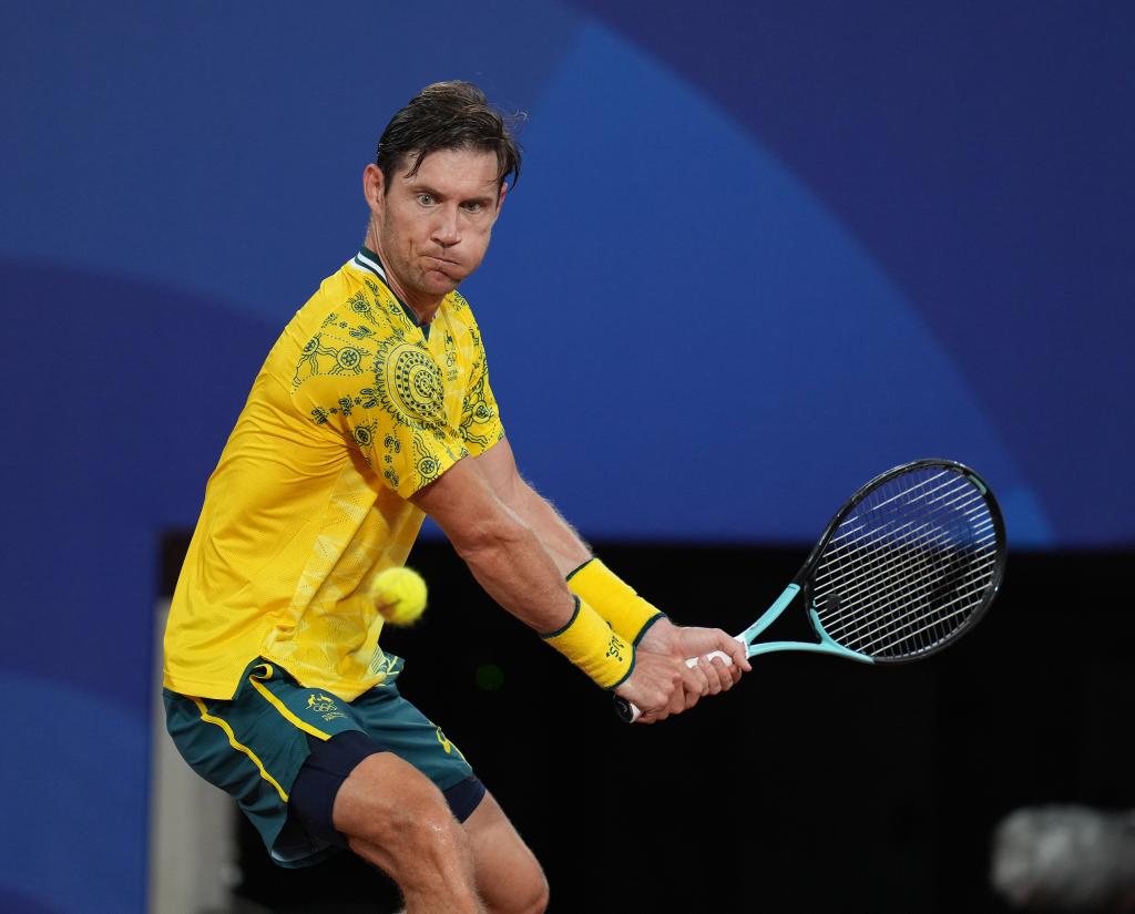 7月27日,伊布登在比赛中回球。当日,在巴黎奥运会网球男子单打首轮比赛中,塞尔维亚选手焦科维奇2比0战胜澳大利亚选手伊布登,晋级下一轮。新华社记者 万象 摄