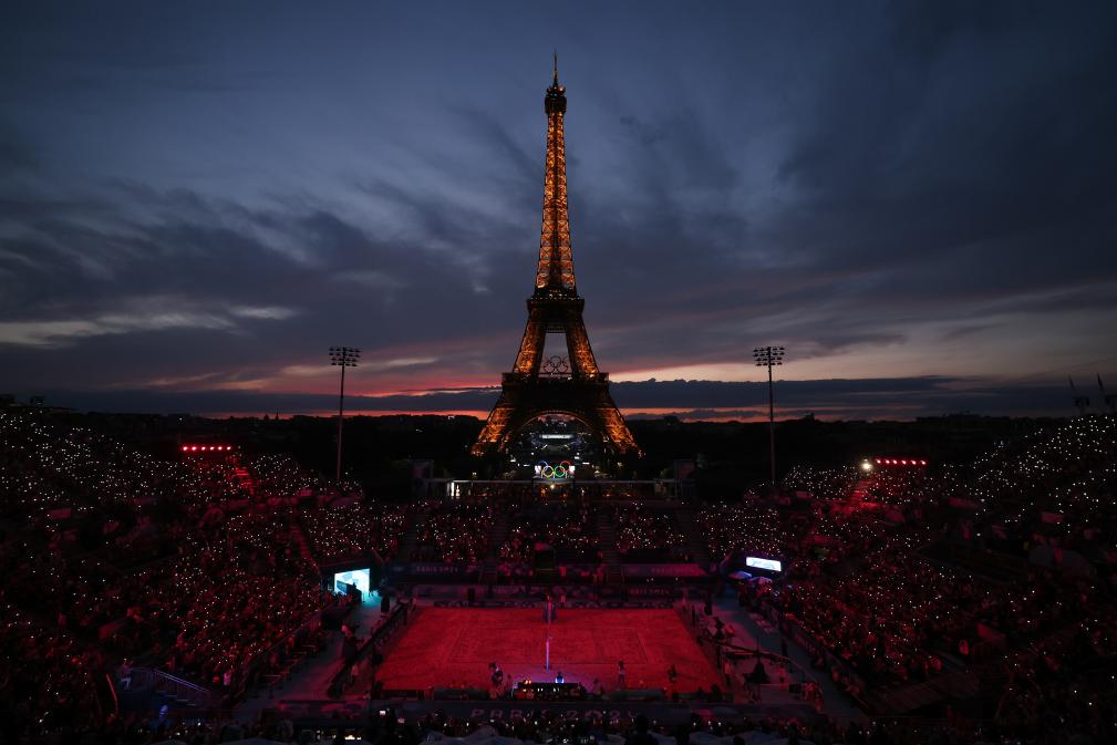 7月27日,巴黎奥运会沙滩排球比赛在埃菲尔铁塔体育场举行。雨后的巴黎,晚霞与铁塔、赛场交相辉映。新华社记者 黄宗治 摄