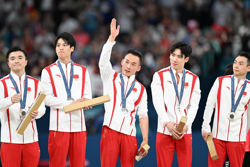 7月29日,中国队选手在颁奖仪式上。当日,在巴黎奥运会体操男子团体决赛中,中国队获得亚军。新华社记者 刘大伟 摄