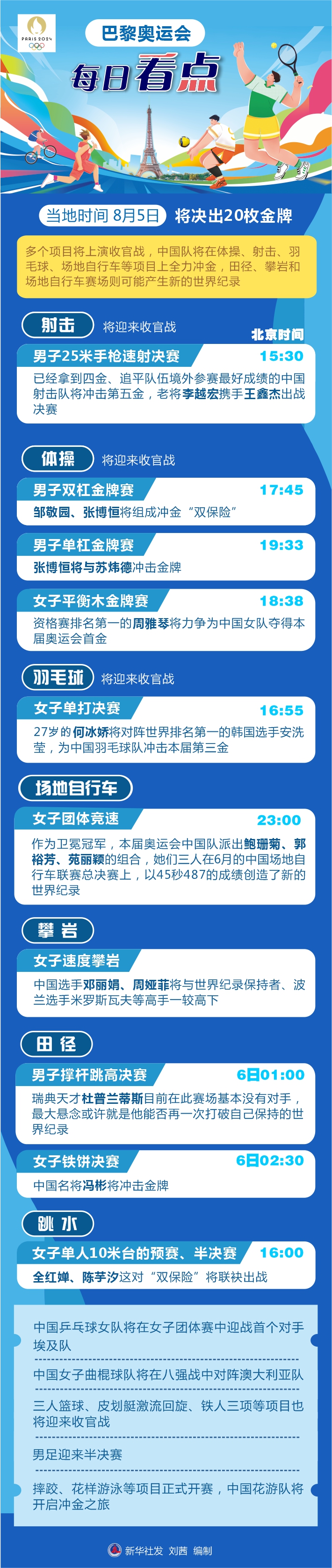 新华社巴黎8月4日电(记者王恒志 张泽伟)巴黎奥运会5日将产生20枚金牌,多个项目将上演收官战,中国队将在体操、射击、羽毛球、场地自行车等项目上全力冲金,田径、攀岩和场地自行车赛场则可能产生新的世界纪录。