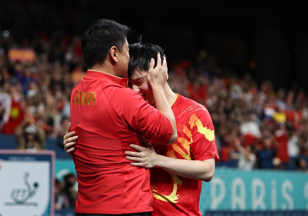 8月4日,樊振东(右)与教练王皓庆祝胜利。新华社记者 王东震 摄