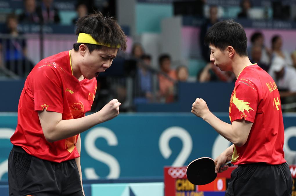 8月7日,中国组合马龙(右)/王楚钦在比赛中。新华社记者 王东震 摄