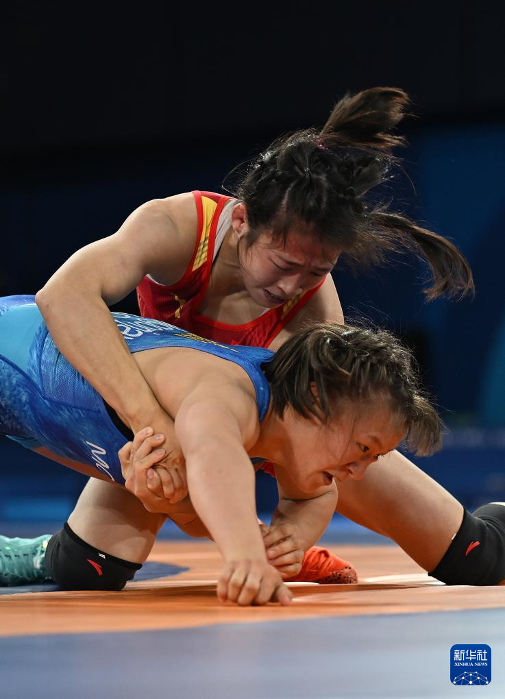8月7日,中国选手冯紫琪(上)和蒙古国选手多尔戈里亚在比赛中。最终冯紫琪获胜摘铜。