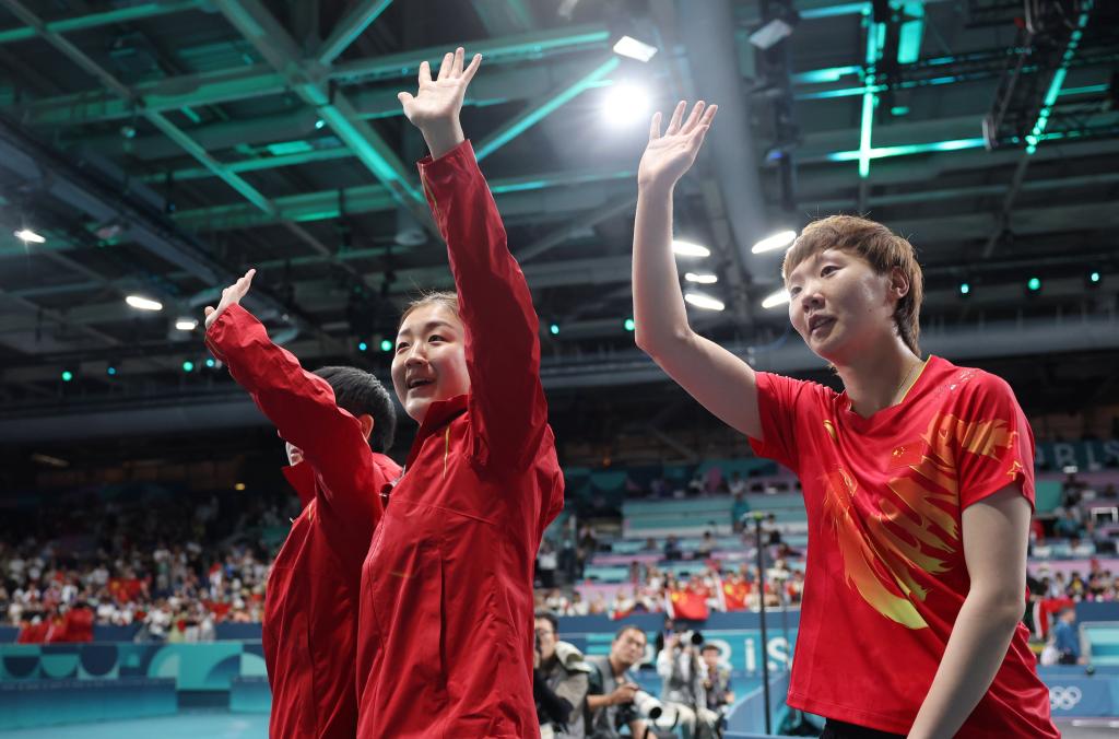 8月8日,中国队选手孙颖莎、陈梦、王曼昱(从左至右)赛后向观众致意。新华社记者 王东震 摄