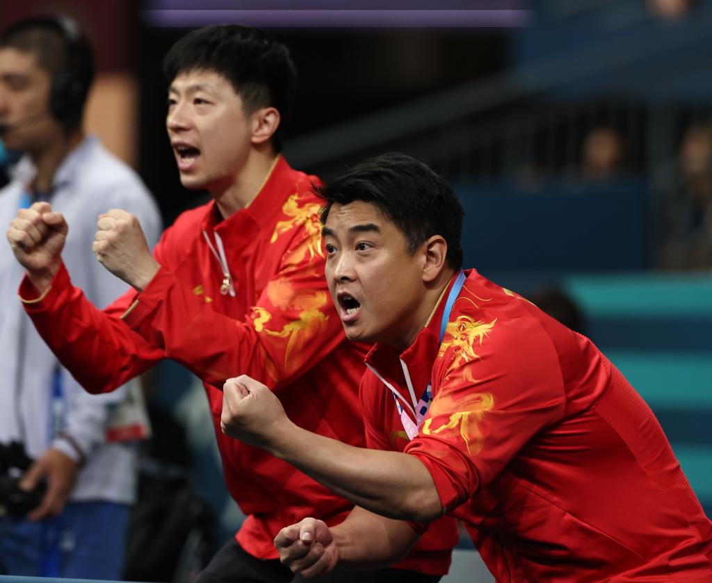 8月8日,中国队教练王皓(右)和运动员马龙为樊振东加油。新华社记者 王东震 摄