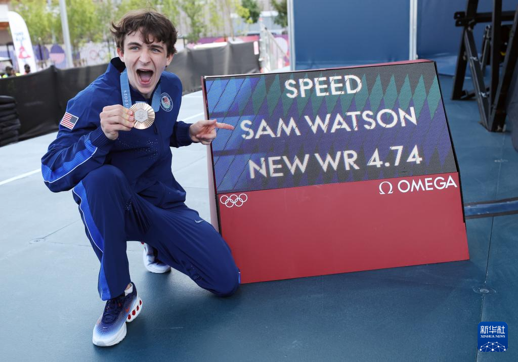 8月6日,季军美国选手沃森在颁奖仪式后庆祝。他在四分之一决赛中以4.74秒的成绩打破世界纪录。