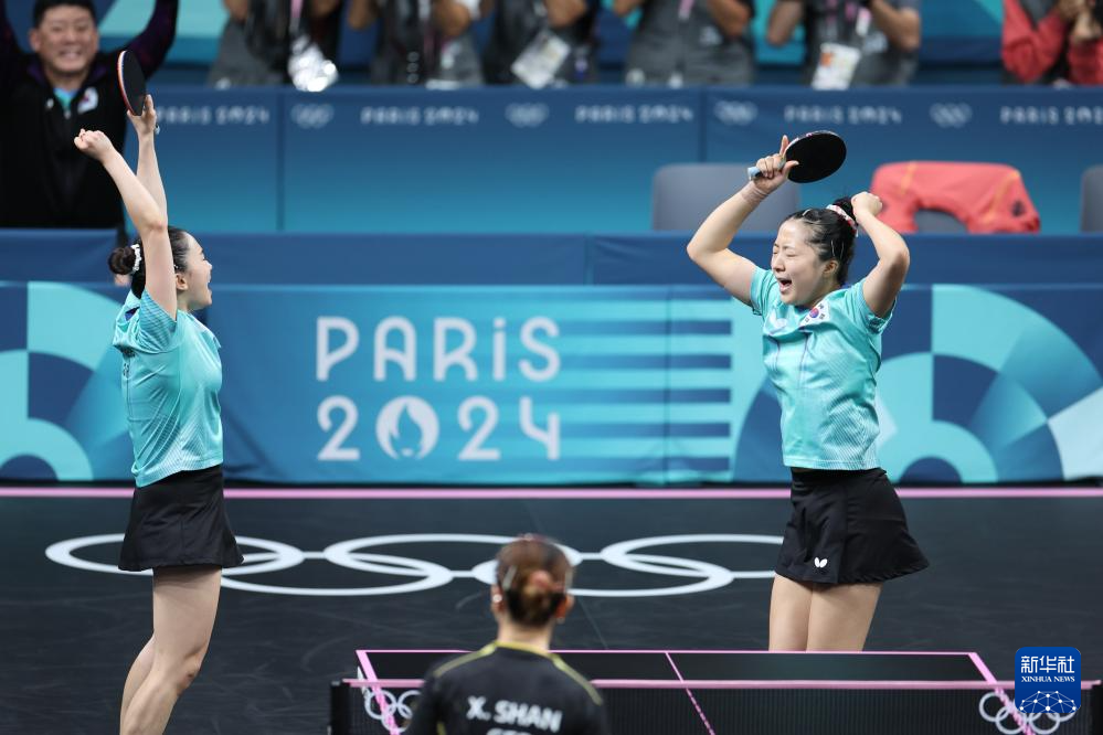 8月10日,韩国队组合申裕斌/田志希(左)在比赛后庆祝。她们3比2战胜德国队选手单晓娜/万远。