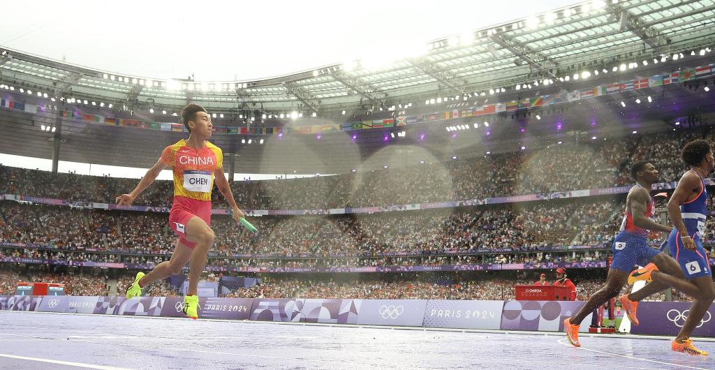 8月9日,中国队最后一棒选手陈佳鹏(左)在比赛中。新华社记者 李明 摄
