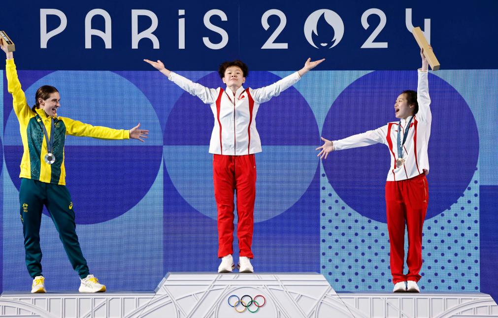 8月9日,冠军中国选手陈艺文(中)登上领奖台。新华社记者 张玉薇 摄