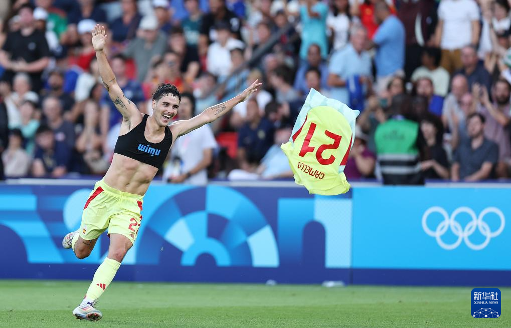 8月9日,西班牙队球员卡梅略在比赛中庆祝进球。