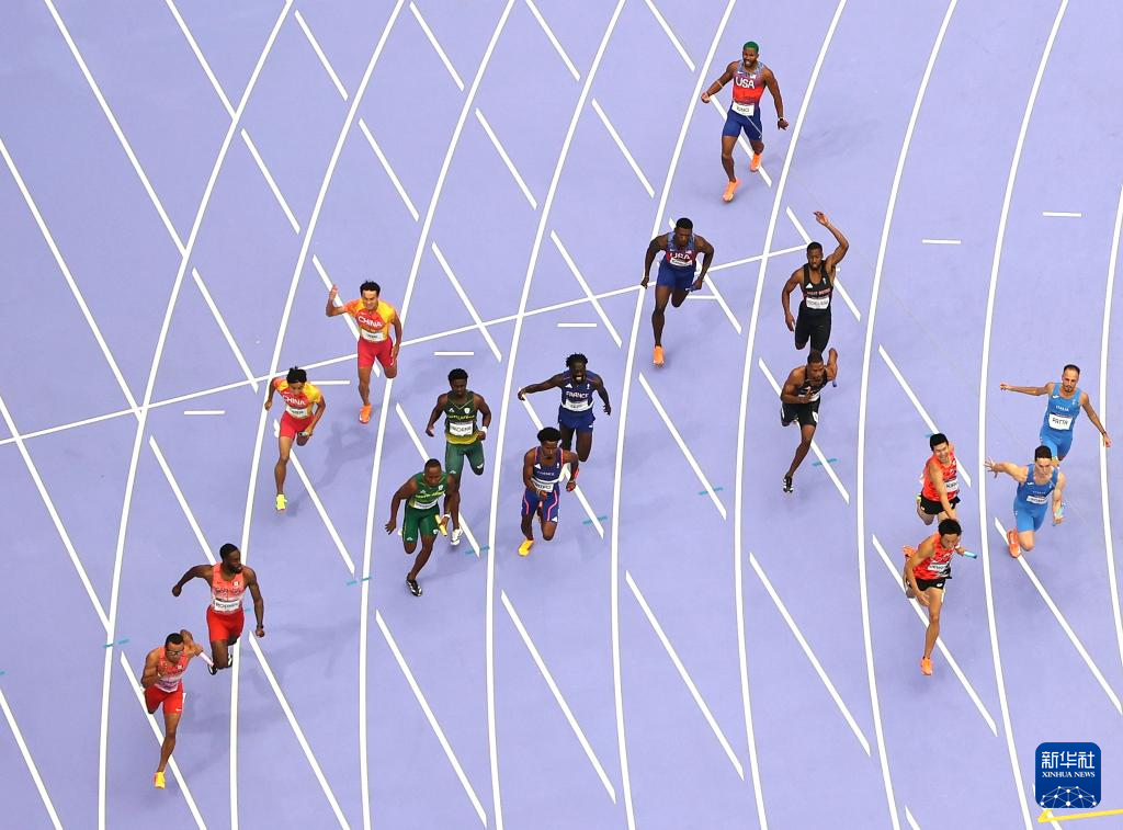 当日,巴黎奥运会田径男子4X100米接力决赛在法兰西体育场举行。