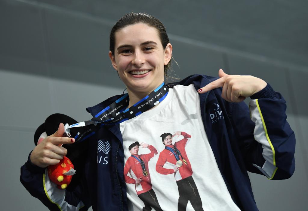 4月20日,2024年跳水世界杯总决赛女子3米板季军基尼在颁奖仪式后展示印有好友、中国跳水运动员陈艺文和昌雅妮图像的服装。新华社记者 李一博 摄