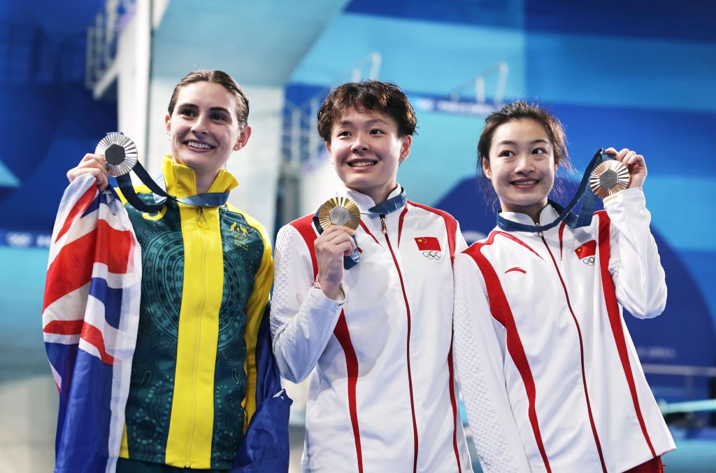 新华社巴黎8月9日电(记者乔本孝 李嘉)9日的巴黎奥运会跳水女子三米板颁奖仪式上演了一出“老友记”。当金牌得主、中国选手陈艺文跃上最高领奖台时,亚军澳大利亚选手基尼和季军中国选手昌雅妮在两边摆出了欢迎“巨星”登场的动作,场面十分有爱。