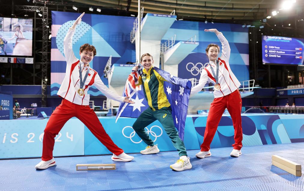 8月9日,冠军中国选手陈艺文(左)、亚军澳大利亚选手基尼(中)、季军中国选手昌雅妮在颁奖仪式后。当日,在巴黎奥运会跳水项目女子3米板决赛中,中国选手陈艺文获得金牌,澳大利亚选手基尼获得银牌,中国选手昌雅妮获得铜牌。新华社记者 张玉薇 摄