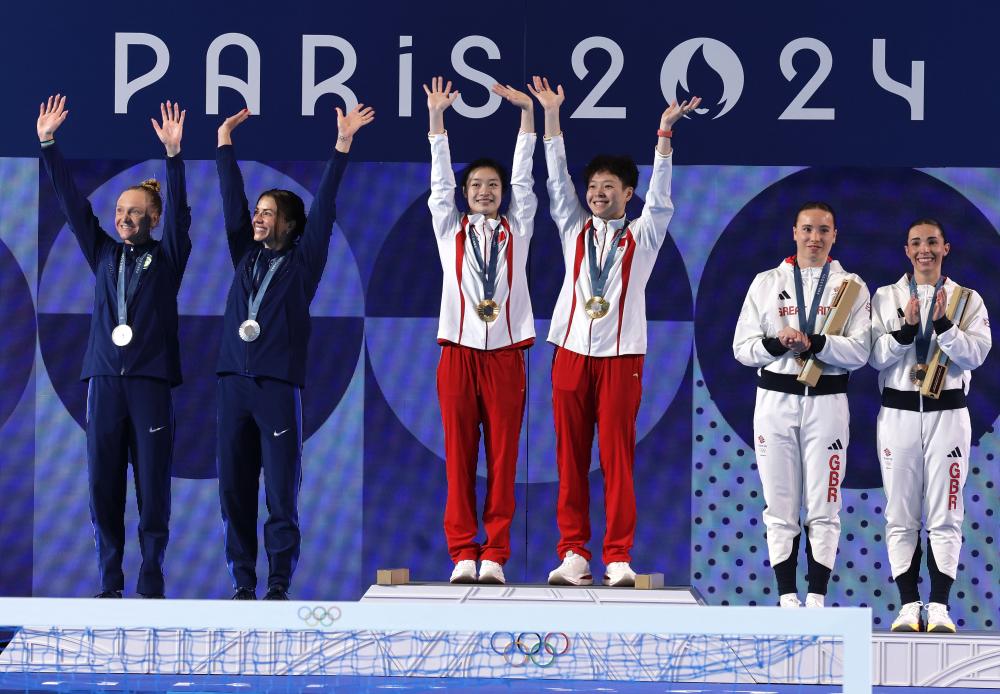 7月27日,冠军中国选手昌雅妮(左三)/陈艺文(左四)、亚军美国选手培根(左一)/库克(左二)、季军英国选手哈珀(右二)/米尤-詹森(右一)出席颁奖仪式。新华社记者 张玉薇 摄