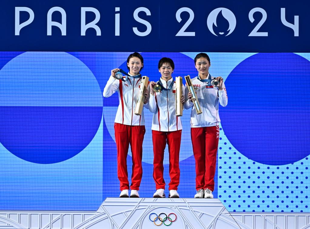8月6日,全红婵(中)、陈芋汐(左)和金姬燕在颁奖仪式上合影。新华社记者 王鹏 摄