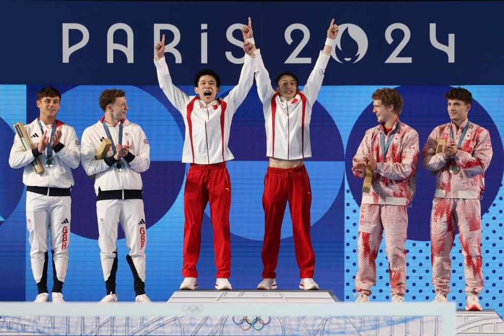 7月29日,冠军中国选手练俊杰(左四)/杨昊(左三)登上领奖台。新华社记者 李颖 摄