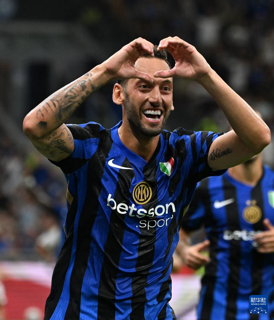 8月24日,国际米兰队球员恰尔汗奥卢在比赛中庆祝得分。新华社发(奥古斯托·卡萨索利摄)