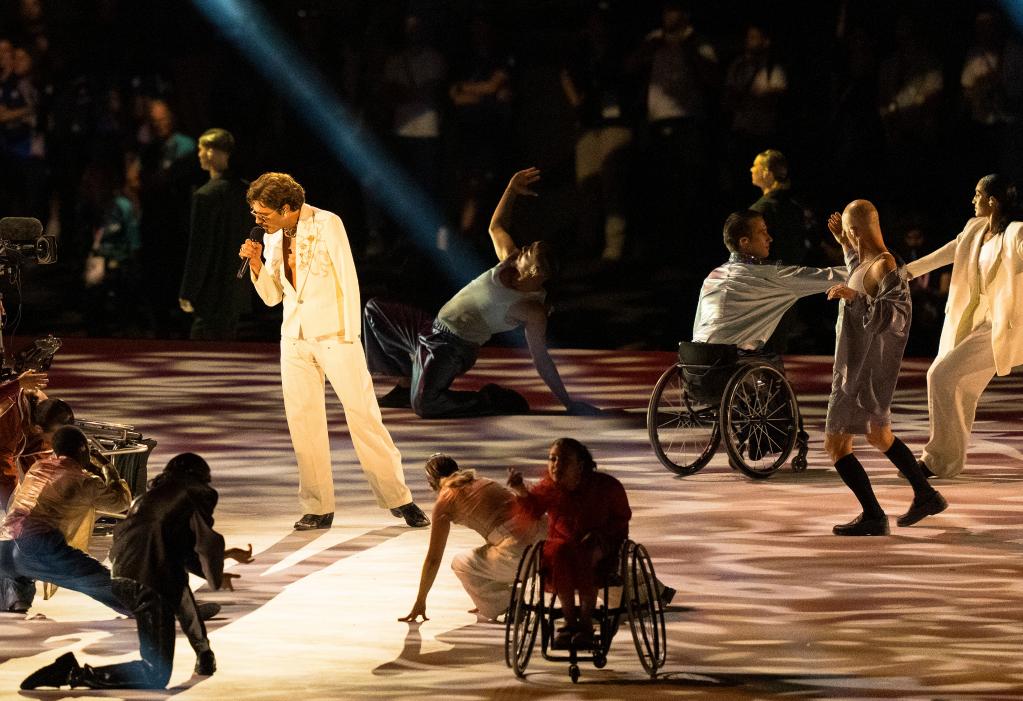 最后的《庆祝》篇章里,舞台色彩缤纷、氛围无比欢乐,歌颂了创意带来的社会变革和更美好、更包容、更团结、更积极的世界。舞台上,轮椅旋转着,灯光和焰火将表演推向高潮。