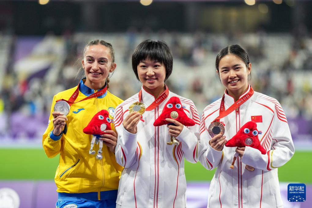 8月30日,冠军中国选手文晓燕(中)、亚军乌克兰选手纳塔利娅(左)和季军中国选手蒋芬芬在颁奖仪式上。新华社记者 张铖 摄