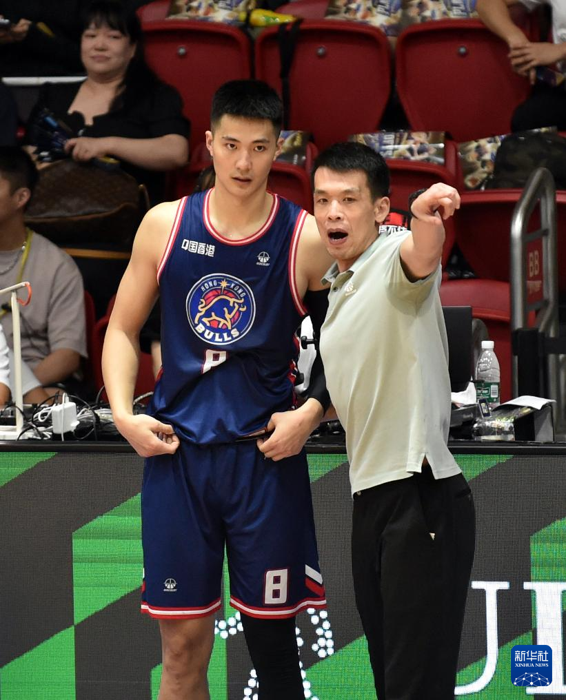9月1日,香港金牛篮球队主教练解立彬(右)在比赛间隙向球员朱松玮布置战术。