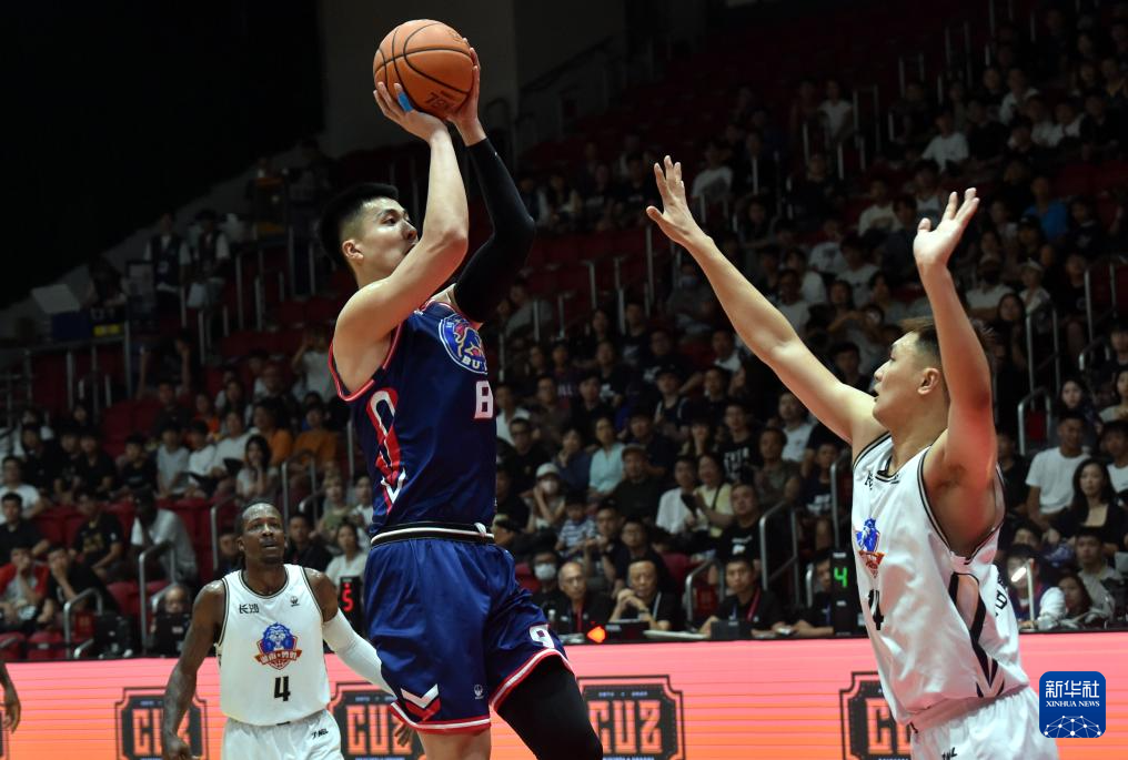 9月1日,香港金牛队球员朱松玮(中)在比赛中投篮。