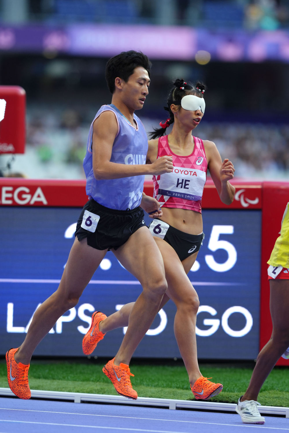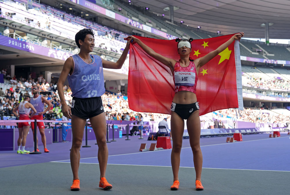 新华社巴黎9月3日电(记者陈地、单磊、季嘉东)冲过巴黎残奥会女子1500米T11级决赛的终点线,梳着可爱丸子头的何珊珊和她的引跑员游俊杰紧紧拥抱在了一起,这是搭档近两年来他们的第一次拥抱。尽管没能站上最高领奖台,但何珊珊在收获一枚宝贵银牌的同时,也创造了新的亚洲纪录。这一刻的拥抱,是幸福的。