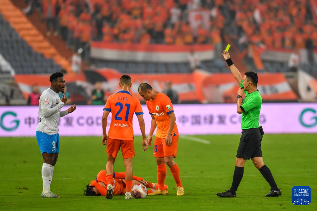 9月13日,主裁判向青岛西海岸队球员里亚斯科斯(左一)出示黄牌。