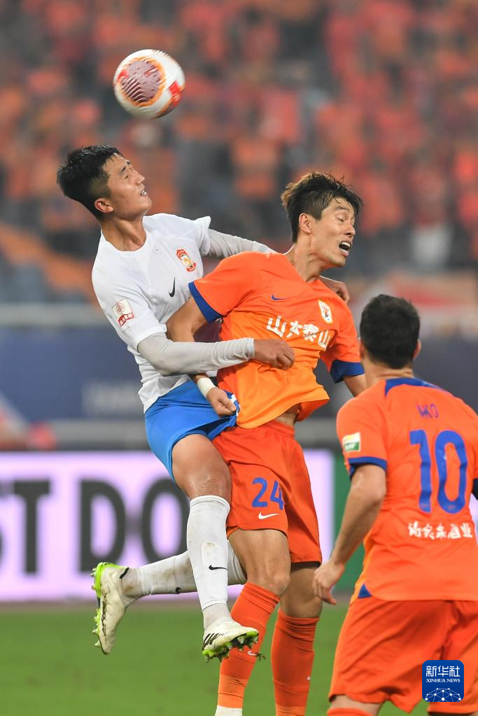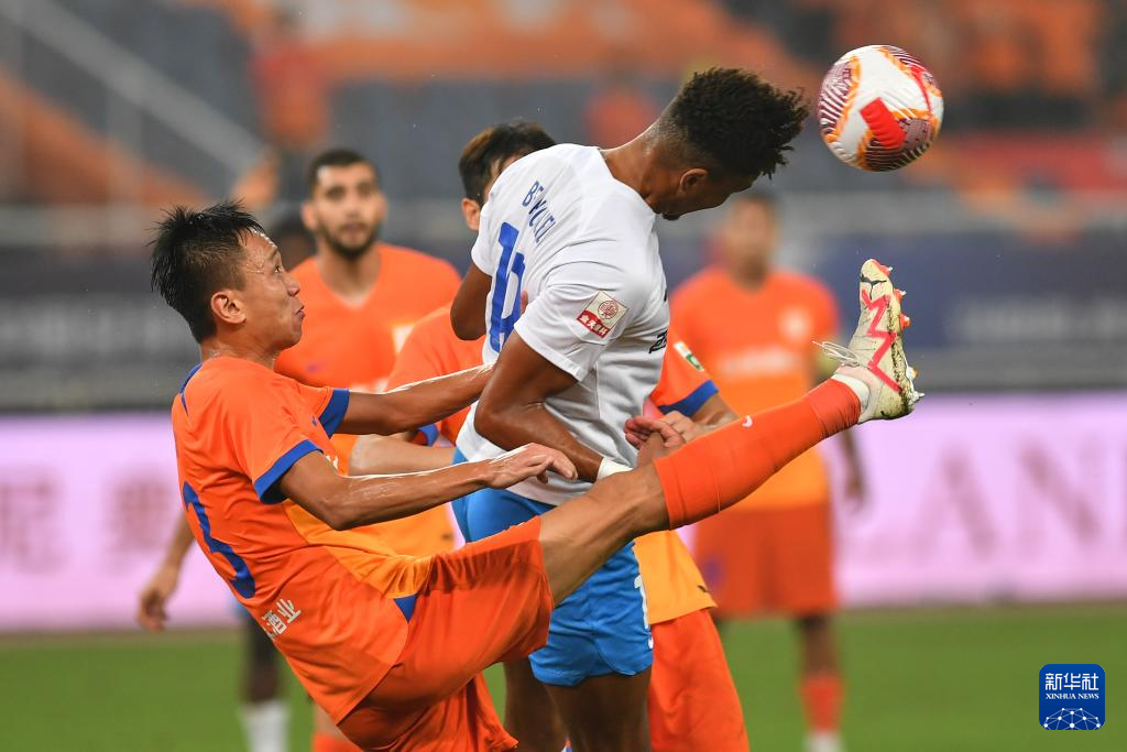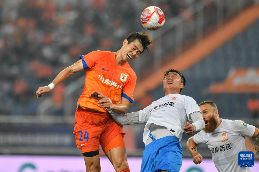 9月13日,山东泰山队球员毕津浩(左)在比赛中争顶。