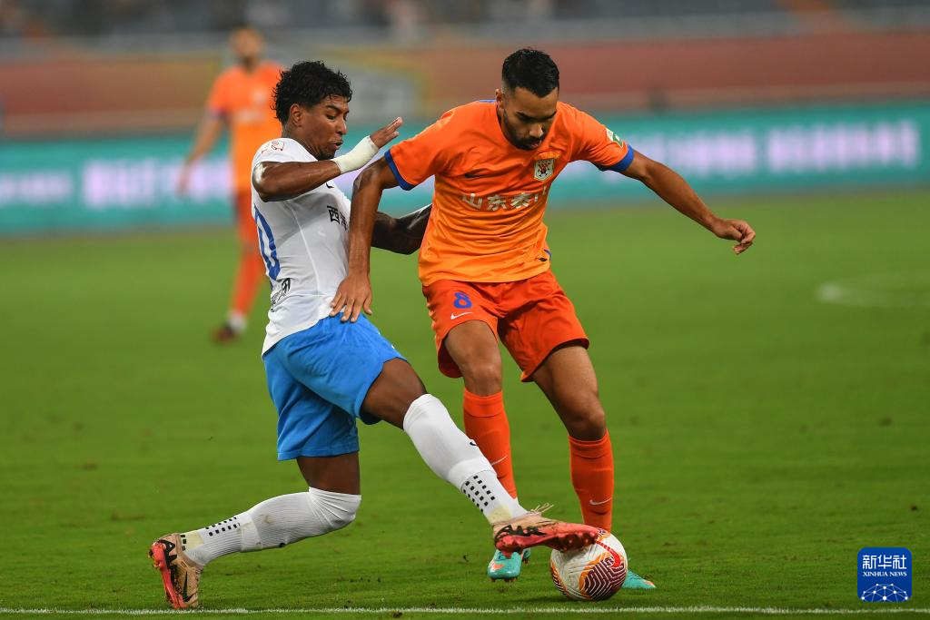 9月13日,山东泰山队球员德尔加多(右)在比赛中带球。