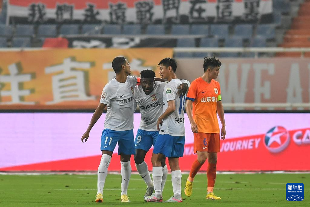 9月13日,青岛西海岸队球员庆祝进球。