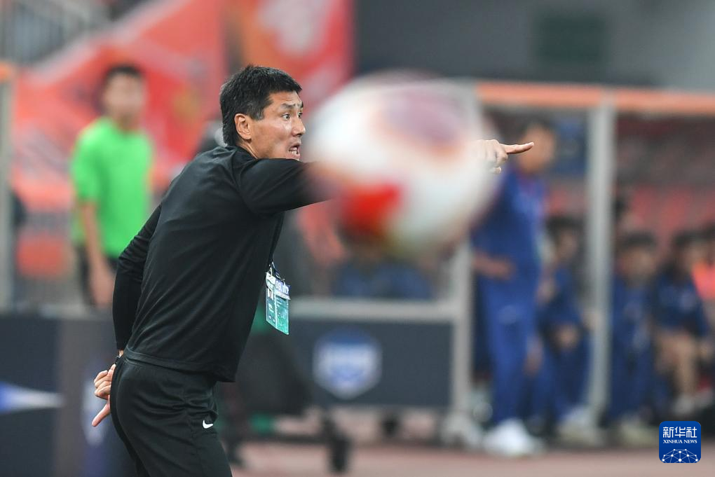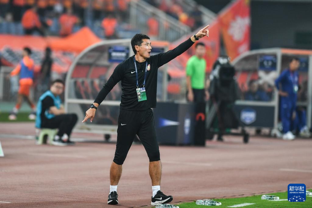 9月13日,青岛西海岸队主教练邵佳一在比赛中指挥。